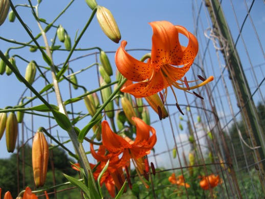 This orange spotted Asiatic lily has been with us for several years. Purchased as part of an assortment, it is nameless but hardy. Two bulbs have become a dozen. Two large pots were filled with emerging plants this spring so that they could be moved into the basement when frost threatened. While the potted lilies enjoyed the warmth of the basement the others were left to make do with plastic bucket covers. The ones near the fence in the background are ready to bloom. One planted out in the main garden experienced a colder night as it was located in a natural frost drain that sweeps across the slightly lower land. It is totally dead as are the daughter plants that surrounded it. We will check the condition of those bulbs. Weeks of growing time preceded the killing cold so the bulbs may have stored enough energy to fuel an attempt to flower next year. Fall visitors are always welcome to surplus plants here. These lilies have created an abundant surplus of mature bulbs.