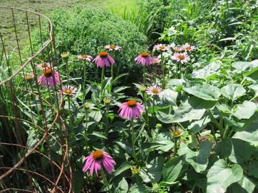 We actually had some rain and it was cool for a day or maybe it was two. At least the temperature has dropped from the nineties to the eighties. Some places in the garden look pretty good. The cone flowers, sedums and sunflowers in Ed's garden down by the road look great! He has been carrying water to them and the clay in the soil helps to retain the moisture.