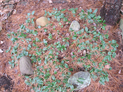 Lasting snowfall found us early this year. Tasks that are normally completed in early December were hidden beneath the snow. When warm days and clear skies finally returned we had a chance to get some of the needed work done. Arbutus is a native wildflower that might be expected to make it on its own. These plants were moved here and placed in a location of my choosing. That left me responsible for seeing to it that favorable conditions prevail. This spot under a white pine tree seemed perfect. Pine needles decay producing the very acid soil necessary for Arbutus growth and this ground was near the driveway. Small detours when getting the mail allowed frequent visits to these plants.
